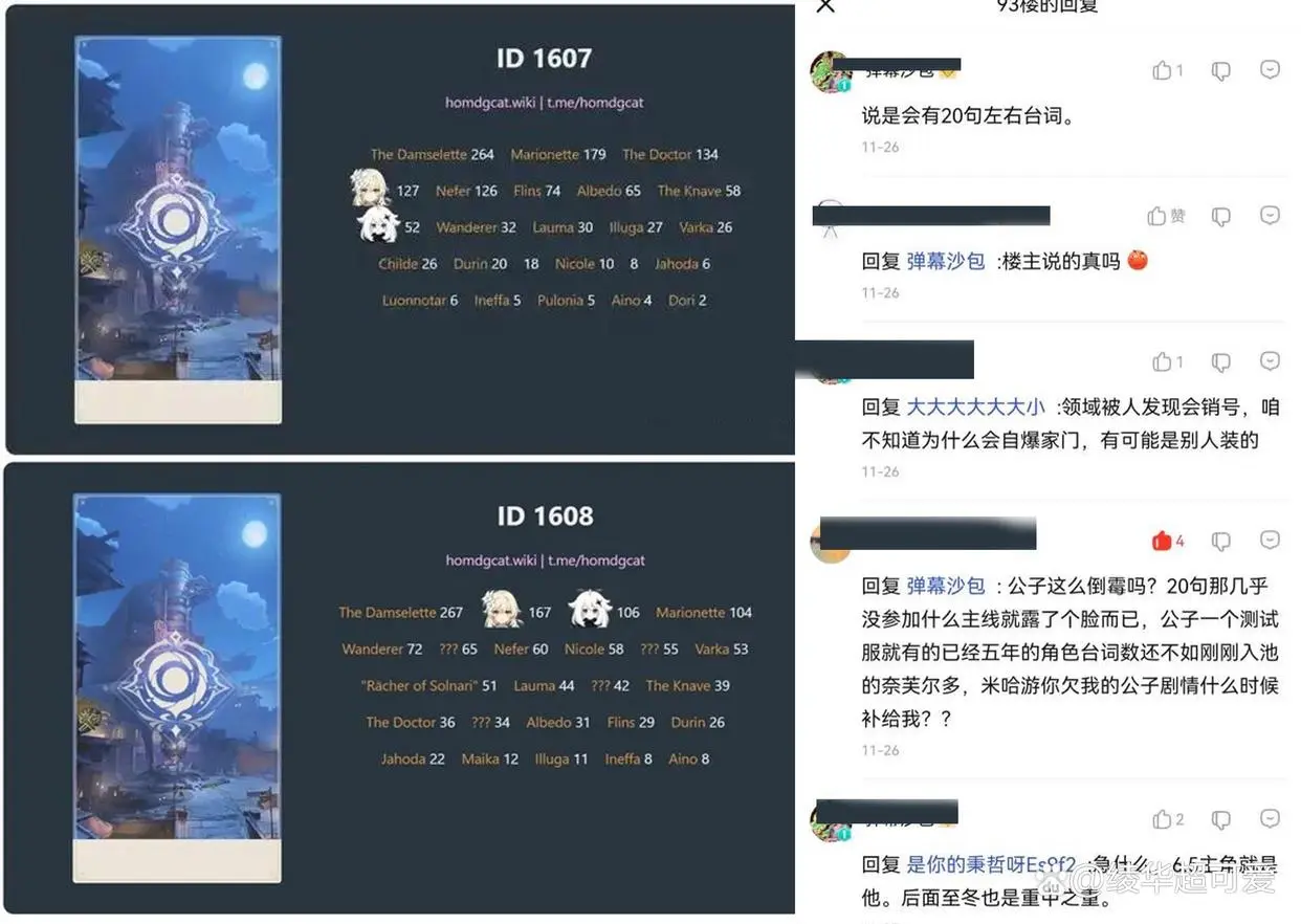 另外,6.3版本的魔神任务台词数也被统计了出来,台词过百的角色分别是少女的531句,空荧的294句,木偶的283句,奈芙尔的186句,派蒙的158句,博士的150句,散兵的104句和菲林斯的103句。此外,占位符显示,魔神任务最后负责引出下一部分的人是大团长!