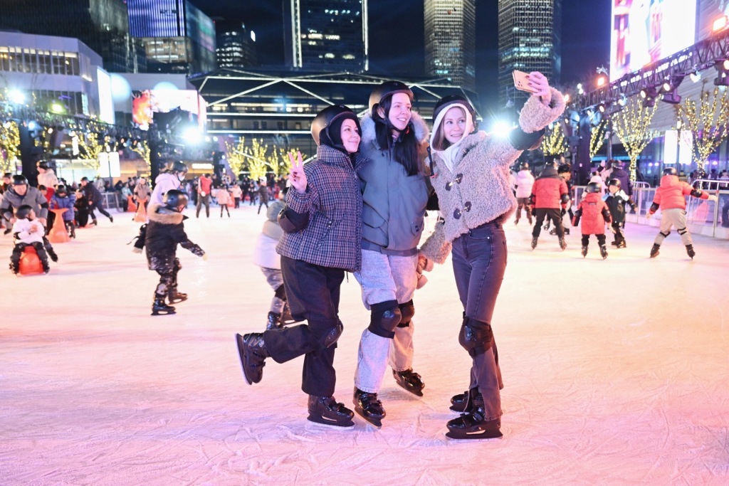 2025年12月31日晚,来自俄罗斯的达莎(右)和朋友在徐汇滨江露天冰场开启跨年游。澎湃新闻记者 朱伟辉 图